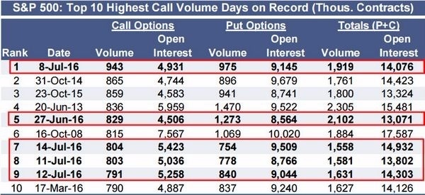 再統計 S&P 500 買權過去歷史前十大成交量的交易日,發現竟有 5 個交易日是落在 6 月 24 日「英國脫歐」確定之後,亦可以確定了美股這波的大多頭行情,可以說是在英國脫歐確定之後才開始爆發。