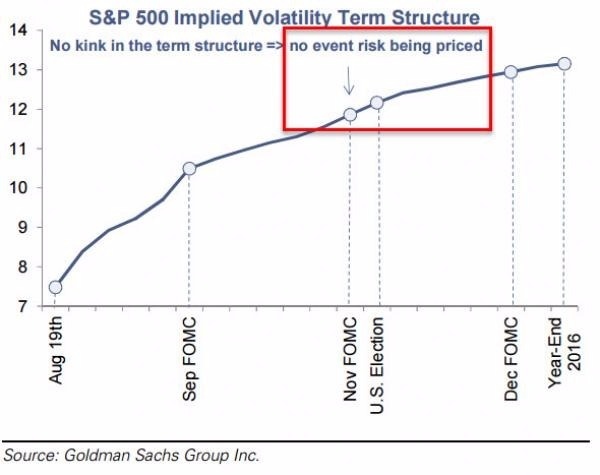 FOMC十一月會議與美總統大選十分接近, 但S&P選擇權市場卻未對此進行風險定價 圖片來源:Goldman SachsFOMC十一月會議與美總統大選十分接近, 但S&P選擇權市場卻未對此進行風險定價 圖片來源:Goldman Sachs