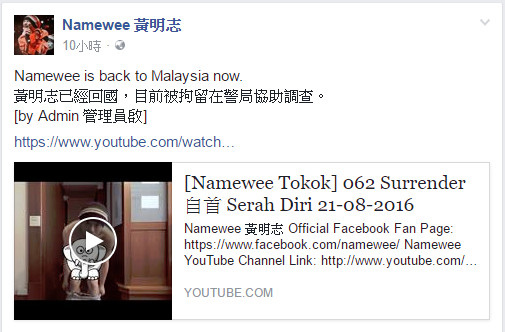 ▲黃明志回到馬來西亞被捕。(圖/翻攝自黃明志臉書)