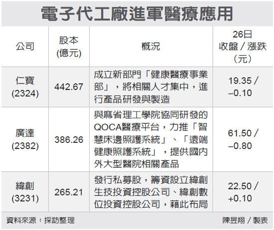 緯創方面,該公司今年初通過擬於不超過3億股額度內,以私募方式發行新股,因應未來轉型需求。緯創指出,此舉目的在於為整合緯創在醫療,及軟體應用的相關投資,透過新資金設立緯創生技投資控股公司、緯創數位投資控股公司,目前都已開始展開布局,今年底前會有新進度對外公告。