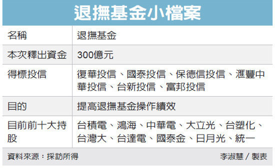 公務人員退休撫卹基金2016年度國內委託經營評選結果昨(29)日揭曉,由復華投信、國泰投信、保德信投信、滙豐中華投信、台新投信、富邦投信等六家投信公司取得簽約資格,各獲50億元委託金額,共300億元;市場預期,短期內有300億元資金可挹注台股。