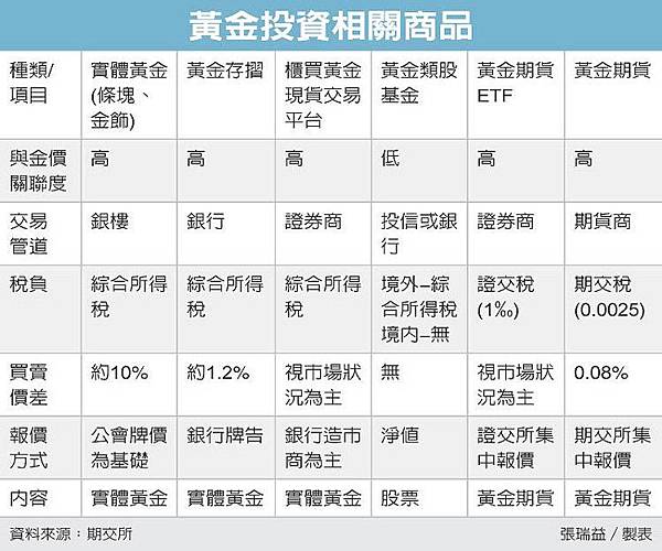 期交所有三種黃金類商品,包括契約規格10盎司的美元計價黃金期貨、10台兩的新台幣計價黃金期貨及5台兩的台幣計價黃金選擇權。