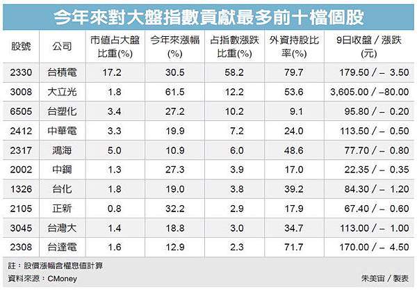 根據法人統計,今年來推升台股大盤指數貢獻度最多的是台積電,不但還原權值後有三成的漲幅,在大盤指數今年來上漲826點的同時,獨自推升台股達437點,推升指數貢獻度超過一半。外資更是一路買超台積電,有近80%的股東都是外資。