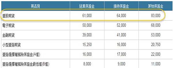 至於 ... 要匯多少保證金呢? 台指期1口83000元 小型期1口20750元 電子期1口68000元 金融期1口53000元 我們先來看一下,期交所最新的「商品保證金」表