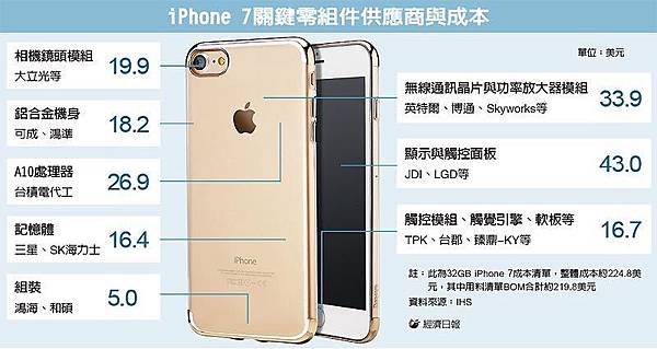 【i7漲代工價鴻海和碩補】 市調機構IHS公布32GB版本iPhone 7材料成本清單,整機代工費用提升至5美元(約新台幣157元),相較前一代SE機種僅3.8美元增逾三成,兩大組裝廠鴻海、和碩營運吃補。 儘管成本大幅墊高,蘋果仍將iPhone 7基本款售價維持與前一代旗艦機相當的649美元(約新台幣2萬元)不變,大幅對消費者與供應商讓利之際,材料總成本僅占新機售價僅約35%,換算一支新機毛利率高達近65%,等於「賣一支賺超過兩支」,扣除研發、行銷等費用後,蘋果仍然「賺很大」。