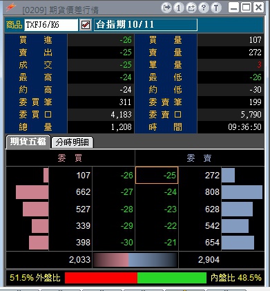 10月台指期終場成交在9,260點,漲71點或0.77%,不含鉅額及價差交易的成交量為113,440口,未平倉量為110,930口。另外,台指期正價差7.4點,電子期逆價差0.03點,金融期正價差0.66點。