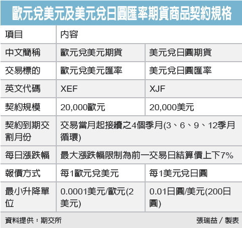 期交所歐元兌美元及美元兌日圓期貨,分別以歐元兌美元匯率及美元兌日圓匯率為標的,契約規模為2萬歐元及2萬美元,並依外匯市場報價習慣,歐元兌美元期貨以美元計價,最小升降單位0.0001美元;美元兌日圓期貨以日圓計價,最小升降單位0.01日圓。