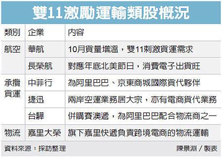 阿里巴巴雙11全球狂歡節即將在下月登場,市場預期,阿里巴巴將挑戰單日交易達到人民幣千億元的目標,對台貨運等運輸概念股而言,可望帶來利多,包括華航、長榮航等航空雙雄及貨運三雄捷迅、中菲行與台驊,還有嘉里大榮、台灣順豐等物流業者,營運將吃補。
