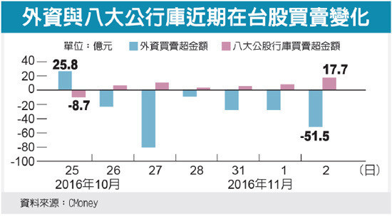 美國總統大選電郵門持續蔓延,加上南韓總統閨密事件擴大,造成國際資本市場動盪,台股昨(11)日重挫逾百點、摜破季線,外資現貨連六賣、期貨多單續減,八大公股行庫逆勢連六買護盤,籌碼戰開打。
