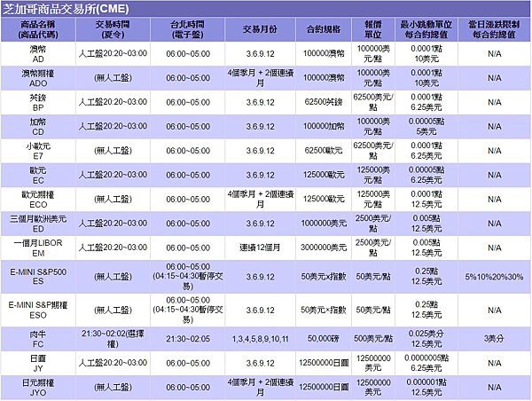 澳幣 英鎊 加幣 小歐元 歐元 歐洲美元 小SP500 合約規格 交易時間 報價單位 張日漲跌幅限制