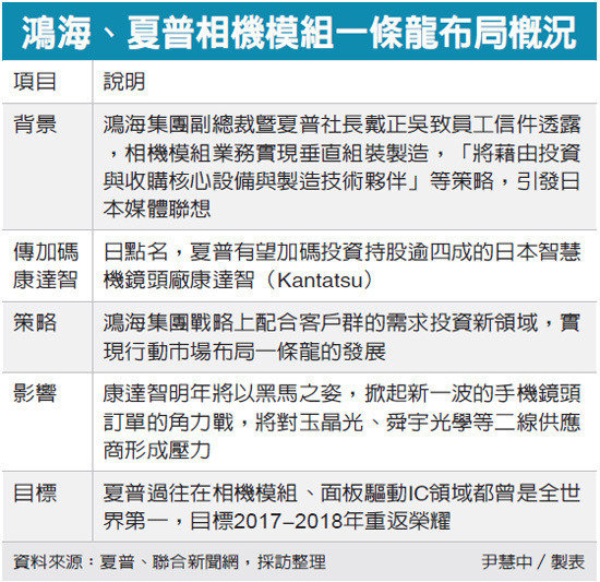 在鴻海集團支持下,夏普傳出將擴大相機模組一條龍投資布局,日媒進一步點名,夏普有望加碼投資光學鏡頭廠康達智(Kantatsu),納為子公司。外界預期,鴻海戰略投資夏普後,也將接手康達智股權,實現鴻海為iPhone提供組裝、面板到上游鏡頭一貫化整合服務。 鴻海集團副總裁暨夏普社長戴正吳最近一次致員工信件透露,相機模組業務將「藉由投資與收購核心設備與製造技術夥伴」等策略,實現垂直組裝製造。儘管戴正吳未點名將擴大投資康達智,但日媒臆測,夏普不排除收購持股逾四成的康達智。 市場分析,康達智先後獲蘋果扶植及夏普注資,隨資金到位,未來恐掀起新一波iPhone訂單角力戰,衝擊大立光、玉晶光等既有鏡頭供應鏈。