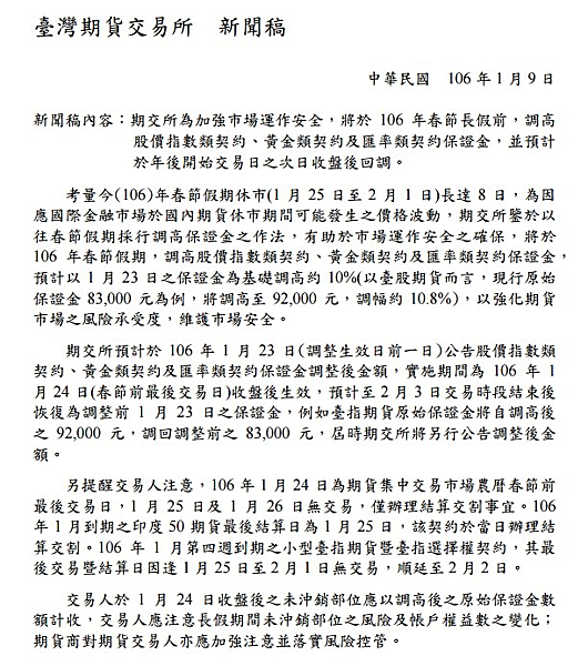 將於106 年春節假期,調高股價指數類契約、黃金類契約及匯率類契約保證金,