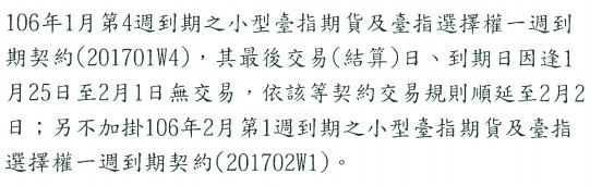 106年1月份w4的週小台和週選擇權的最後交易(結算)日 契約 順延至2月2日