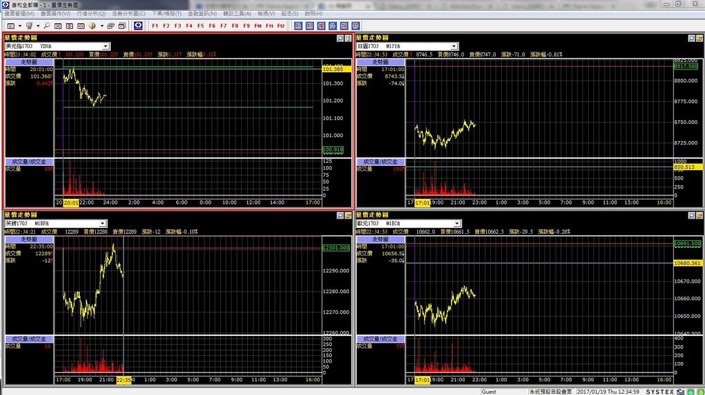 美元指/日圓/英鎊/歐元 期貨量價走勢圖