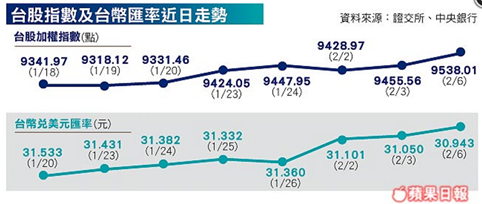 新台幣對美元匯率開春後持續走升,昨天再升值一點○七角,升破卅一元大關,收在卅點九四三元,不僅連續三天升值,更創下廿個月以來新高價。累計雞年三個交易日新台幣累計已升值四點一七角,也引發出口廠商的憂慮。 而在美股收高,以及新台幣強升、資金行情持續等因素帶動下,台股昨天開高越過前波高點,盤中一度上漲逼近百點,終場上漲八十二點,以九五三八點作收,創二○一五年六月四日以來新高。此外,台股昨天成交量一○二三億元,連三個交易日衝破千億元大關,也是二○一五年十一月以來首見。 對於新台幣今年以來強升,外資買超台股規模似乎相對有限,中央銀行外匯局長顏輝煌昨天說,新台幣匯價由市場供需決定,外資都有進有出,目前觀察,外資只要進來都有買股,沒有看到有炒匯的現象,央行都會密切關注。 顏輝煌表示,今年以來韓元升值幅度高於新台幣,新台幣匯價仍相對穩定,「我們尊重市場」。除非有新台幣匯價過度波動,有失序的狀況,央行本於職責就會維持市場秩序。 外匯交易指出,今年以來新台幣只能用一個字來形容「強」,今年一月三日匯價還在卅二字頭,才一個月多就漲到卅字頭,漲了將近一點五元,「真的漲很凶」。 匯銀主管表示,美國總統川普上任後,在政策的推動及執行上都引發爭議,不確定性升高。美國最新公布的一月非農就業數據雖優於預期,但失業率及薪資增長率表現則低於預期。市場認為美國聯準會(FED)三月不會升息,導致美元走貶,資金流向亞洲新興市場;昨天外銀跟進拋匯,使新台幣站穩卅字頭的價位。 此外,央行近期對匯市波動的容忍度也「愈來愈寬」,讓新台幣動輒出現二、三角的波動。匯銀主管指出,央行已經半年以上、約九個月沒有在尾盤出手「維持秩序」,一方面是顧忌被美國列為匯率操縱國而遭到川普貿易報復,也是趁勢放手讓出口商「長大」,希望出口商能因應市場匯兌風險、做好避險,不能總依賴央行。 展望後市,匯銀主管認為,在川普政府釋放出不樂見美元太強,以及聯準會會議紀錄顯示升息積極度不如預期之下,國際美元大跌一波後將進入盤整期,短期內美元不易扭轉跌勢。 台灣景氣對策訊號連續數月出現綠燈且進出口數據在改善中,顯示台灣經濟基本面有進一步走強的機會,給予新台幣匯價支撐。但另一家大型商銀主管則認為,近期新台幣升太凶,已經快要達到央行的容忍極限,即使怕被美國盯上列為匯率操縱國,央行應該也會有所動作,以遏止外資炒匯之風再起。
