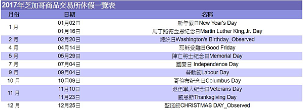 ▲ 2017年芝加哥期貨交易所休假一覽表