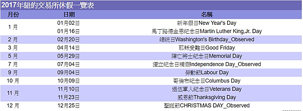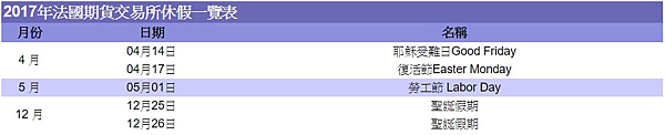 ▲ 2017年英國倫敦國際金融期貨休假一覽表
