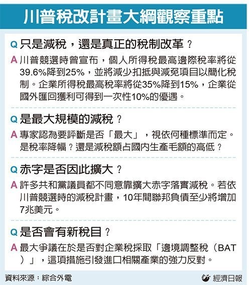 白宮官員透露,美國總統川普計劃26日宣布稅務改革的大綱,推動可能是「歷來規模最大的減稅」,將尋求降低個人所得稅,並把企業稅降至15%,甚至不惜讓預算赤字增加。