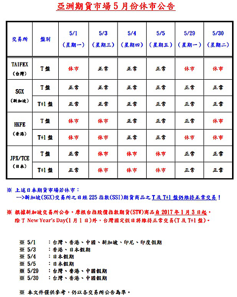 亞洲期貨市場5月份休市公告