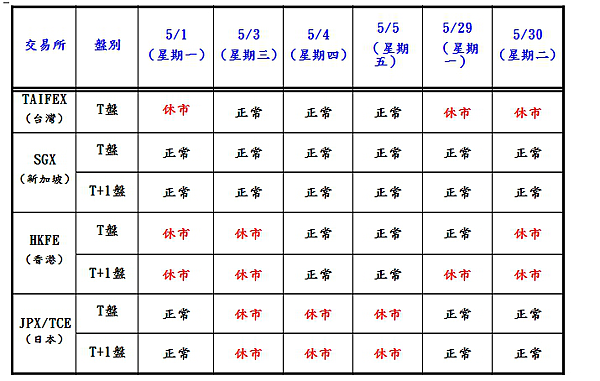 TAIFEX (台灣期貨交易所) 休市日期 : 5/01 (星期一) 、 5/29(星期一)、 5/30 (星期二)