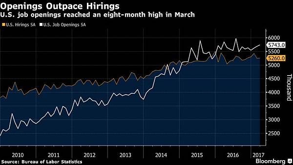 3 月份職位空缺數上升 6.1 萬,至 574 萬人(市場預期為 573 萬),2 月份修正為 568 萬(初值為 574 萬)