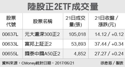 在A股叩關成功的議題下,陸股ETF正2均出現大量,綜觀成交量最高者為元大滬深300正2約10.5萬張,其次為富邦上証正2的5.3萬張,排名第三的是國泰A50正2達4,800張,量能均明顯優於先前。