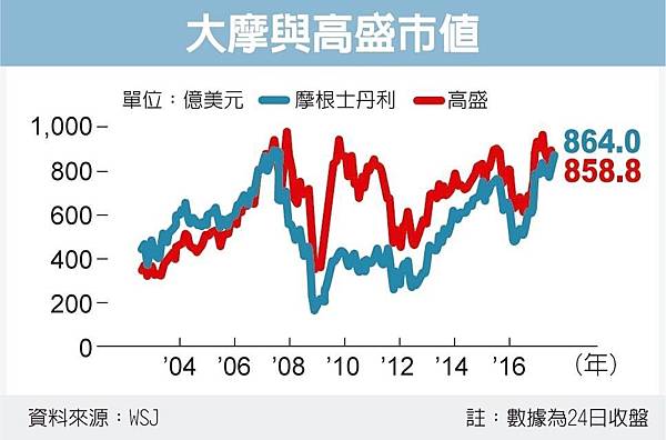 大摩股價24日收漲0.26%至46.71美元,市值增至864億美元。相較下,高盛股價收跌0.91%至,市值減至858.8億美元。大摩市值上次超越高盛,約是在2007年6月,但從同年8月被反超至今。根據FactSet,2009年時高盛的市值比大摩多出約530億美元。