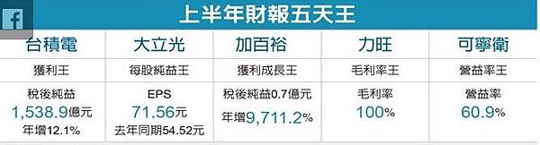 【半年報五天王出列台積獲利稱霸】 上市櫃公司上半年財報明(14)日全數公告,五大天王率先出爐,上半年獲利王、每股純益(EPS)王分別由台積電、大立光奪下,獲利成長王由加百裕拿下,毛利率王是力旺,營益率王則是可寧衛。上市櫃上半年財報進入最後發布階段,至今已有逾七成公司公告財報。 資料來源:鉅亨網 udn