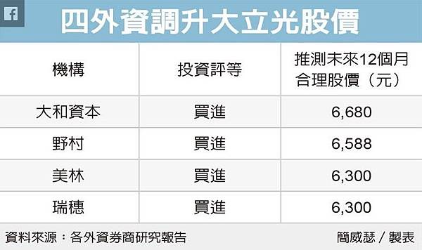 【蘋果新機效應大立光股價喊到6,680】 外資對股王大立光推測合理股價競逐戰再度開跑,大和資本、瑞穗證券雙雙將推測合理股價,拉上6,680元與6,300元,前者一舉躍居外資圈最高。在蘋果新機正式問世前,這些動作,將牽動國際資金再度進駐以大立光為首的蘋果供應鏈。 外資對大立光財務預測,大立光今年每股純益站上200元大關,明、後年可望分別來到300元與400元以上,每年以百元幅度成長,極為驚人。 資料來源:udn 鉅亨網