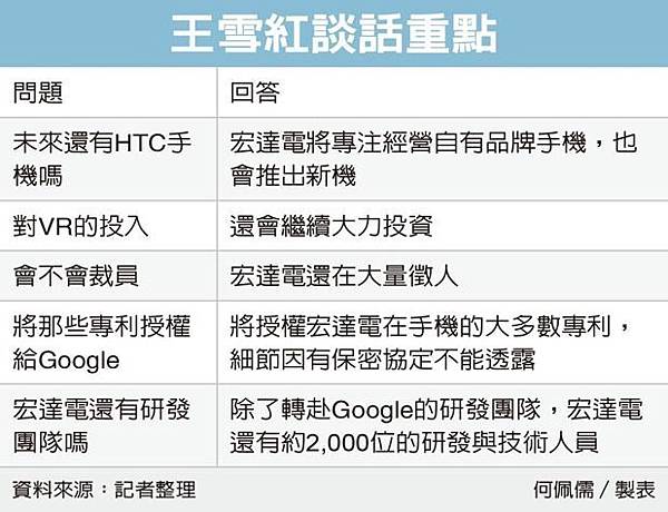 答:這個投資給宏達電財務上很好的調配,可以投入AR、VR技術、內容跟產業鏈,也要投入5G、物聯網及AI人工智慧等。只要看到好的願景,都要長期投資,對於願景跟創新的堅持沒有底線。