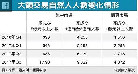 【台股熱大戶劇增六成】 股市大戶大舉參與台股萬點行情。根據統計,集中市場與櫃買市場的第3季成交金額超過1億元的自然人,分別達11,020人與4,372人,共15,392人。 單季成交金額達1億元以上的自然人,即為股市大戶。證券專家說,大戶肩負造市的功能,活躍度是台股重要的人氣指標。