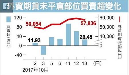 期貨小靜分享期貨新聞! 【外資期現貨雙頭做多】 外資10月以來只有一天賣超、11日單日買超高達95億元,被視為此波推升台股走揚的重要支撐。 外資持續買超的同時,台指期未平倉淨多單仍達5.7萬口,後市偏向樂觀。 星期三是台指期結算,外資在期貨市場的動態,基本反映對後市的看法,相較於自營商、投信淨空單合計超過3萬口,外資在台指期部位則是偏多,淨多單部位逾5.7萬口。