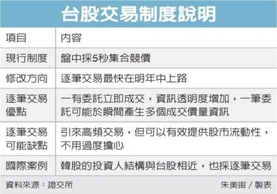 現行國際主要市場如紐約、泛歐、德國、英國、日本、香港、新加坡等已開發市場,韓國、上海、深圳、泰國、馬來西亞、印尼等新興市場,盤中均採逐筆交易撮合。顧立雄昨日首度透露,台灣預計2019年上線改為逐筆交易。