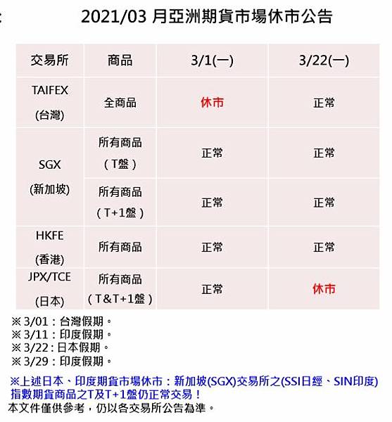 2021年03月亞洲期貨市場休市公告 (3/1台灣期貨全商品休市一日、3/22日本盤全期貨商品休市一日)