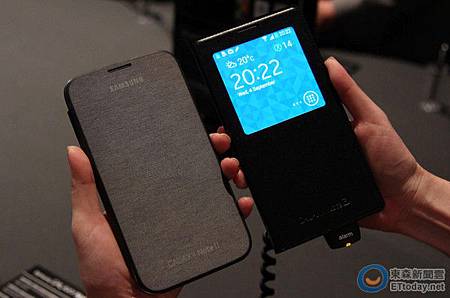 ▲和 GALAXY Note 2 相比,GALAXY Note 3 就連皮套的設計都改用皮革感,並延用 GALAXY S4 以來所採用的 Smart Cover,蓋上之後可以顯示/接聽來電、看時間等內容。(圖/記者洪聖壹攝)